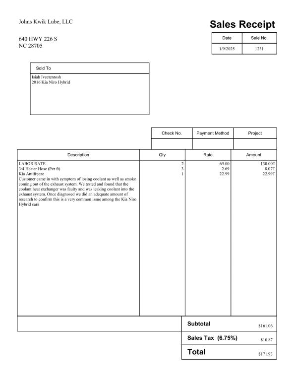 At this point, I brought the car to John’s Kwik Lube in Spruce Pine. They listened, re-diagnosed the issue, and confirmed that the coolant heat exchanger was faulty- exactly what I had suspected. After some research, they also told me this is a known and common issue in Kia Niro Hybrids and that Kia should have recognized it from the start, especially after I brought it to their attention.